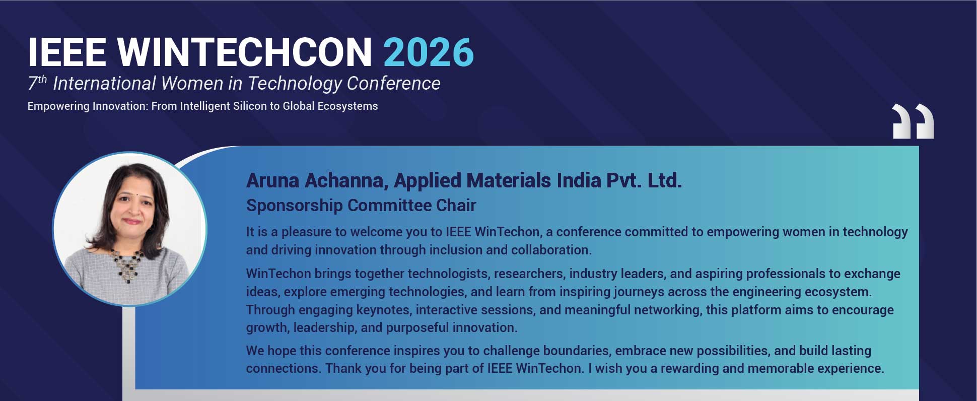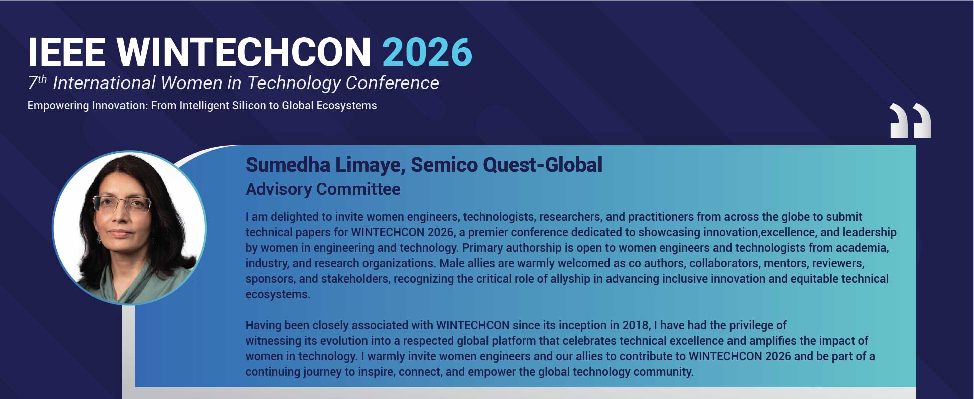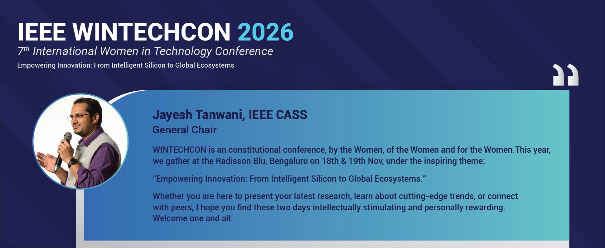 WinTechCon 2026 will be the seventh edition of the conference. It is organized in partnership with IEEE CAS (Circuits & Systems Society) Bangalore Chapter, IEEE Bangalore Section and IEEE WIE (Women in Engineering) Council Bangalore. The theme for this year conference is “Empowering Innovation : From Intelligent Silicon to Global Systems”. Get ready to experience another great year of WINTECHCON and we look forward to seeing you at the conference.